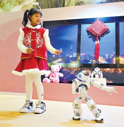 2月24日,2026年全市科技创新大会核心展示单元——未来家庭新春展演上,汉研汉产人形机器人与一名小女孩互动共舞。 长江日报记者何晓刚 摄 |