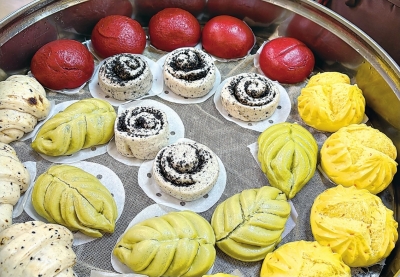 九州上膳坊的五行馒头取天然果蔬汁上色,颜值与美味兼具。 长江日报记者刘晨玮 摄 |