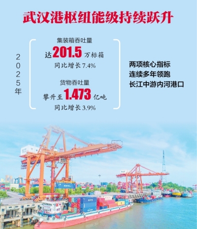 长江日报讯(记者汪文汉)2月25日,长江日报记者从交通运输部官网获悉,全国港口货物、集装箱吞吐量公开披露,2025年武汉港集装箱吞吐量达201.5万标箱,同比增长7.4%;货物吞吐量同步攀升至1.473亿吨,同比增长3.9%。集装箱吞吐量与货物吞吐量两项核心指标连续多年领跑长江中游内河港口,武汉港的枢纽能级持续跃升。