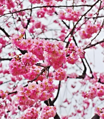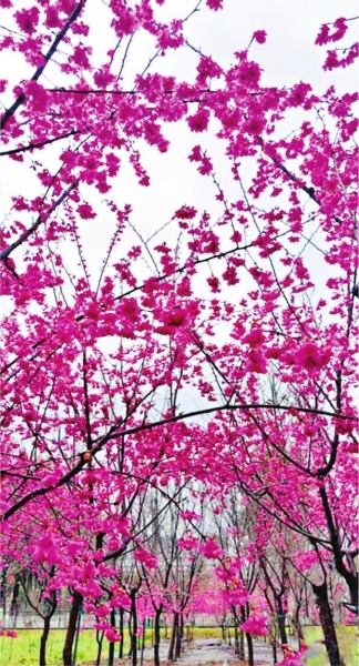 在市园林科学研究院“楚樱”科研苗圃内,率先绽放的两种“楚樱”正值盛花期,繁花似锦,灿若云霓。