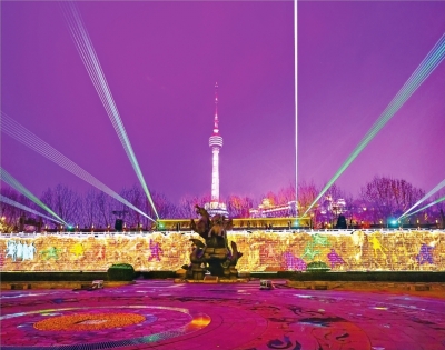 晴川灯会的光影秀与龟山电视塔、知音殿的夜景融为一体。 |