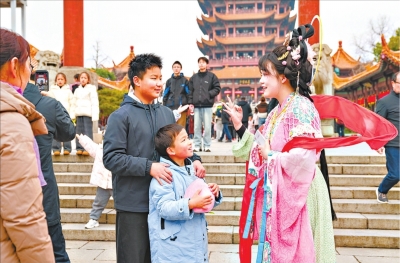 穿过热闹的古肆街,就来到黄鹤楼南门入口处。“以前是看楼,现在是‘入戏’。”来自广州的游客陈先生感慨,从检票口到鹅池,所有一线员工均身着古装,让他瞬间“穿越”。这个春节,黄鹤楼文旅公司首次推出“全员古装上岗”,绝非简单的服装变化,而是将整个名楼空间转化为一个庞大的“历史剧场”。日间的《鹤舞楚天》、鹅池笛韵、鸣钟祈福,夜晚的定制光影秀,以及“福禄寿喜财”NPC互动,将诗词中的意境、传说中的吉兆、节庆里的民俗,全部转化为可参与、可游戏的具体行为。游客从“观看者”变成了“参与者”,从“看一座楼”变为“体验一段浓缩的、互动的历史切面”。这正是在用现代文旅语言,翻译和呈现荆楚大地的历史积淀与人文精神。