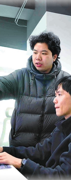 武汉灵境引擎科技有限公司创始人张奥(左)与同事探讨产品开发思路。 长江日报记者高勇 摄 |