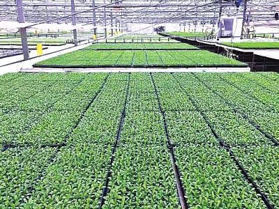 在武湖生态农业园,武汉维尔福种苗有限公司的种苗工厂内,一排排整齐的瓜类蔬菜幼苗茁壮成长。公司负责人杜迎军介绍,这个基地是全市最大的工厂化种苗繁育基地,建设有逾4万平方米的智能化温室、组培中心及育苗车间。在这里,一盘盘如巧克力形状的育苗托盘,能够在自动生产线上完成填基质土、上穴盘、打孔、播种、覆盖、浇水等一系列工序;然后,托盘进入温度可控的发芽室,让种子在72小时内发芽;随后再转至专用温室大棚,在25℃至30℃的温度下,25天左右就长成约10厘米高的植株,供农户移栽至田间地头。这一过程中,起到关键作用的就是武汉市农科院作物所研发的瓜类蔬菜轻简高效育苗技术。