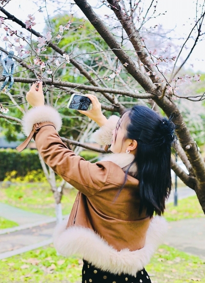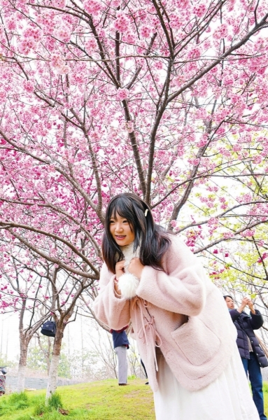 青山科普公园早樱盛开,游客纷至沓来打卡拍照。 长江日报记者詹松 摄 |