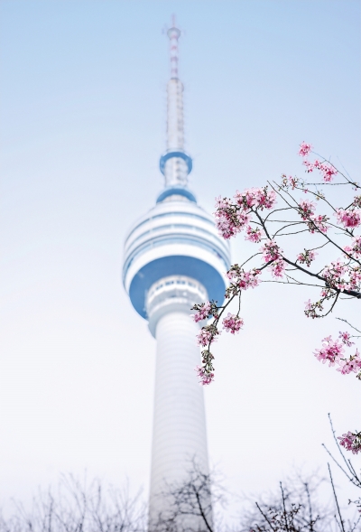 龟山公园绽放的樱花与电视塔同框。 刘雍涛 摄 |