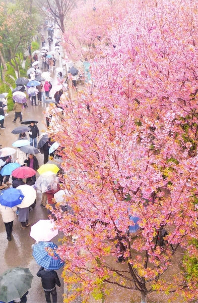 3月15日,乍暖还寒的东湖樱花园,细雨夹着凉风悄然洒落,让奔赴这场花事的市民和游客感受到别样意境。帅气的男生举着相机,为女友定格樱花雨中的笑颜;年轻的父母将孩子扛在肩头,凑近看那一树繁花;操着各地口音的游客在花下合影,衣角沾着花瓣与雨珠。