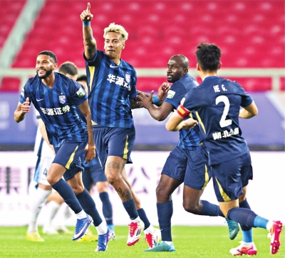 武汉三镇队外援卡迪斯(左二)庆祝进球。 新华社发 |