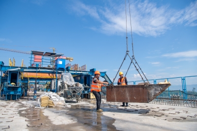 小图为当日,工人在渝万高铁渠溪河双线特大桥建设现场进行大桥合龙后的收尾作业。 (新华社记者 唐 奕 摄)