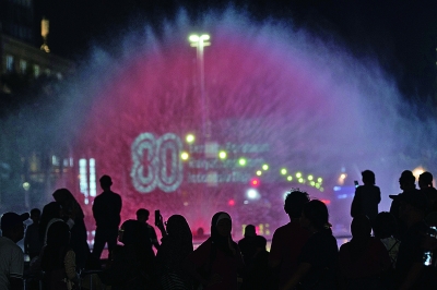 图为当晚,人们在印度尼西亚雅加达举行的印尼独立80周年庆祝活动上观看喷泉灯光秀。 (新华社发)