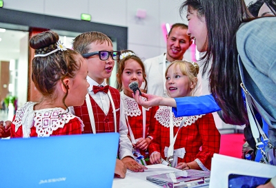 图为当日,在俄罗斯喀山举行的第三届俄罗斯—中国互利合作“萌芽”论坛上,俄罗斯小朋友利用AI智能眼镜与中国来宾对话。 (新华社记者 张超群 摄)