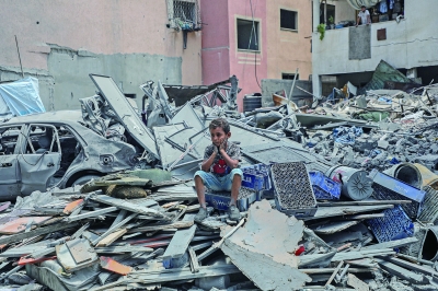 8月8日,一名男孩坐在加沙城以军袭击后的废墟上。(新华社发)