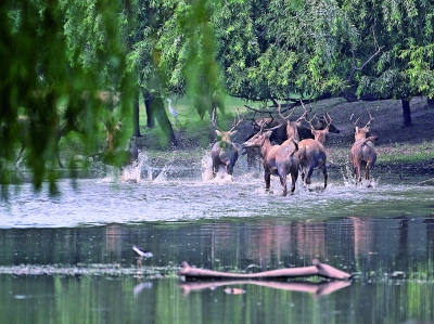 图为8月18日在北京麋鹿苑拍摄的麋鹿。