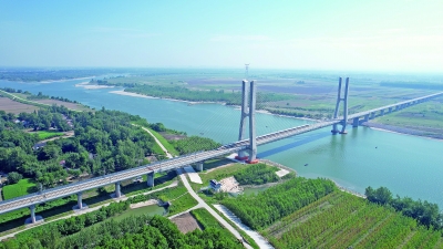 沪渝蓉高铁武宜段起自武汉市,经天门市、荆门市,终至宜昌市,正线全长313公里,设计时速350公里。该段线路于2021年9月开工建设,今年1月完成正线铺轨,5月启动联调联试。图为26日,55402次试验列车通过沪渝蓉高铁武宜段钟祥汉江特大桥。 (新华社发)