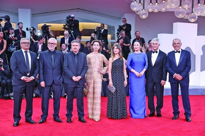 图为8月27日,在意大利威尼斯,主竞赛单元评委出席红毯仪式。(新华社记者 李 京 摄)