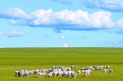 8月26日,在内蒙古呼伦贝尔市鄂温克族自治旗,羊群在草原上吃草(无人机照片)。 (新华社记者 马金瑞 摄)
