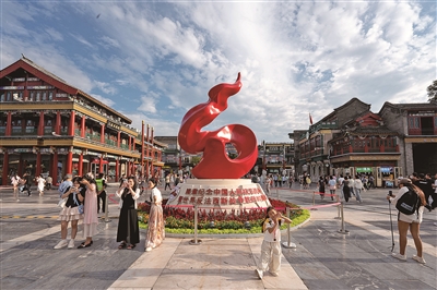 图为当日在前门大街北口拍摄的“万众一心”雕塑。