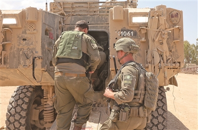 图为8月28日从加沙边境以色列一侧拍摄的以军装甲车和以军士兵。