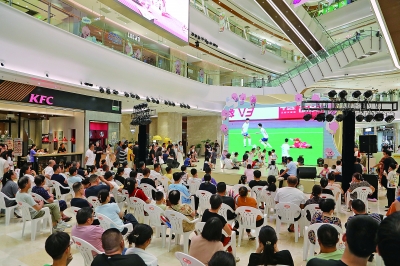 图为8月30日晚,市民在宜兴八佰伴购物中心观赛点观看2025江苏省城市足球联赛无锡队客场挑战盐城队的比赛。