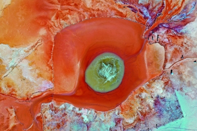 无人机升空,传回的画面令人屏息:泉眼周围,铁锈红、硫磺黄、深褐、墨绿等斑斓的矿物质沉淀物,如凝固的烈焰般向四周辐射蔓延,构成一只巨大、深邃、仿佛正在燃烧的瞳孔!那浓烈的“眼妆”,是大地深处地质力量的泼墨写意。牧民世代相传的敬畏,探险家笔下的惊奇,与现代科技赋予的俯瞰视角在此刻交织。