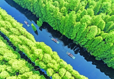 图为近日,游人在江苏省淮安市金湖县水上森林景区乘坐竹筏游览美景(无人机照片)。