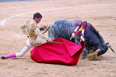 图为9月7日,一名斗牛士在西班牙马德里拉斯本塔斯斗牛场内进行斗牛表演。 (新华社记者 孟鼎博 摄)