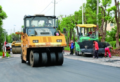 图为施工队在浇注黑色路面。(通讯员 龚建平 摄)
