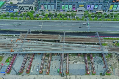 图为9月10日拍摄的已顺利完成顶推横移换梁施工的浙江绍兴城际铁路柯桥站(无人机照片)。
