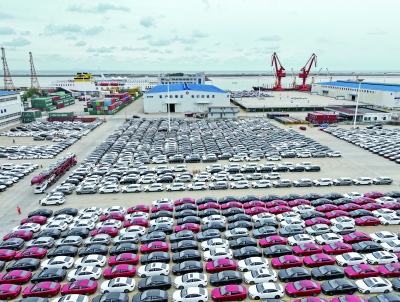 图为9月11日,在江苏省连云港港东方港务分公司码头,大批汽车集港等待装船外运(无人机照片)。 (新华社发)