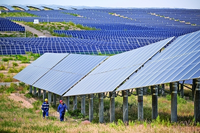 图为9月10日,工人在位于库布其沙漠的达拉特旗光伏基地巡检。 (新华社记者 李志鹏 摄)