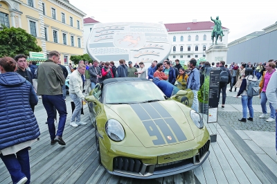 图为当日,在德国慕尼黑,人们在慕尼黑国际车展户外展区保时捷展区参观。 (新华社记者 张 帆 摄)