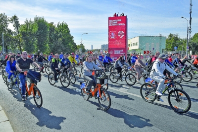 图为 9月13日,人们在俄罗斯莫斯科参加骑行活动。(新华社发)