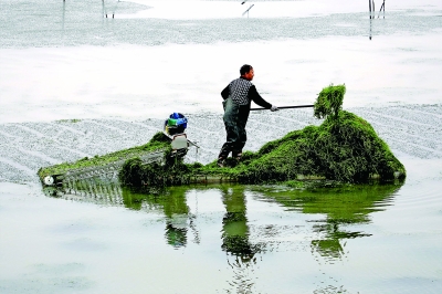 9月12日,位于杨巷镇革新村的市硕金秋生态农林科技有限公司组织员工,为168亩蟹塘清除多余水草。受此前高温影响,塘内水草生长过旺,该公司选择早晚时段作业,全力保障螃蟹稳产。