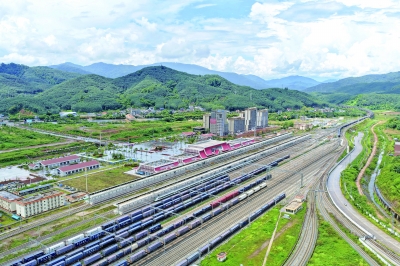图为9月21日,中老铁路上的货运列车在磨憨站通过(无人机照片)。(新华社记者 邢广利 摄)