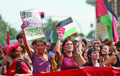 图为9月22日,人们在意大利罗马参加声援巴勒斯坦的示威游行。(新华社记者 李 京 摄)