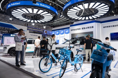 图为9月24日,在株洲国际会展中心,观众(左一)在拍摄配有北斗技术的共享单车。