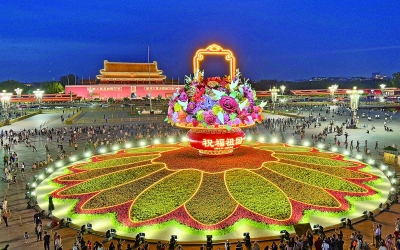 9月25日,2025年“祝福祖国”巨型花篮正式完工,亮相天安门广场与市民共度佳节。今年“祝福祖国”花坛以喜庆的花篮为主景,花坛顶高18米,篮体高16米,篮盘直径12米。篮体南侧书写“祝福祖国”“1949—2025”字样,篮体北侧书写“欢度国庆”“1949—2025”字样。图为9月25日在天安门广场拍摄的“祝福祖国”大花篮夜景。(新华社发)