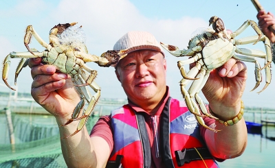 图为当日,蟹农展示捕获的阳澄湖大闸蟹。(新华社发)