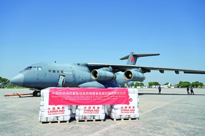 由中国政府捐赠的首批抗洪救灾紧急物资9月28日运抵巴基斯坦。
