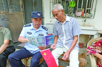 图为9月29日,郑国庆在社区开展节前安全宣防,并与辖区群众在欢声笑语中喜迎国庆。(通讯员 王 杰 摄)