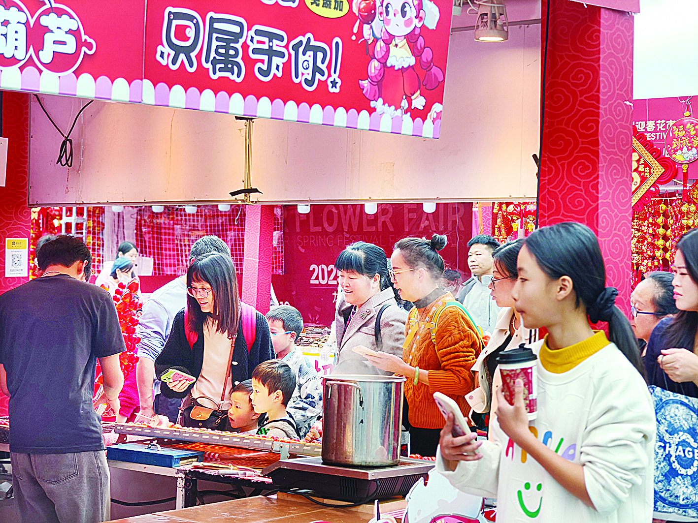 吃饱喝足后,孩子们陪着大人开始选购年货。会发光的大红灯笼、摇头晃脑的财神爷、祝福满满的春联……还有蛇生肖玩偶、迷你对狮等,均被市民朋友们收入囊中。
