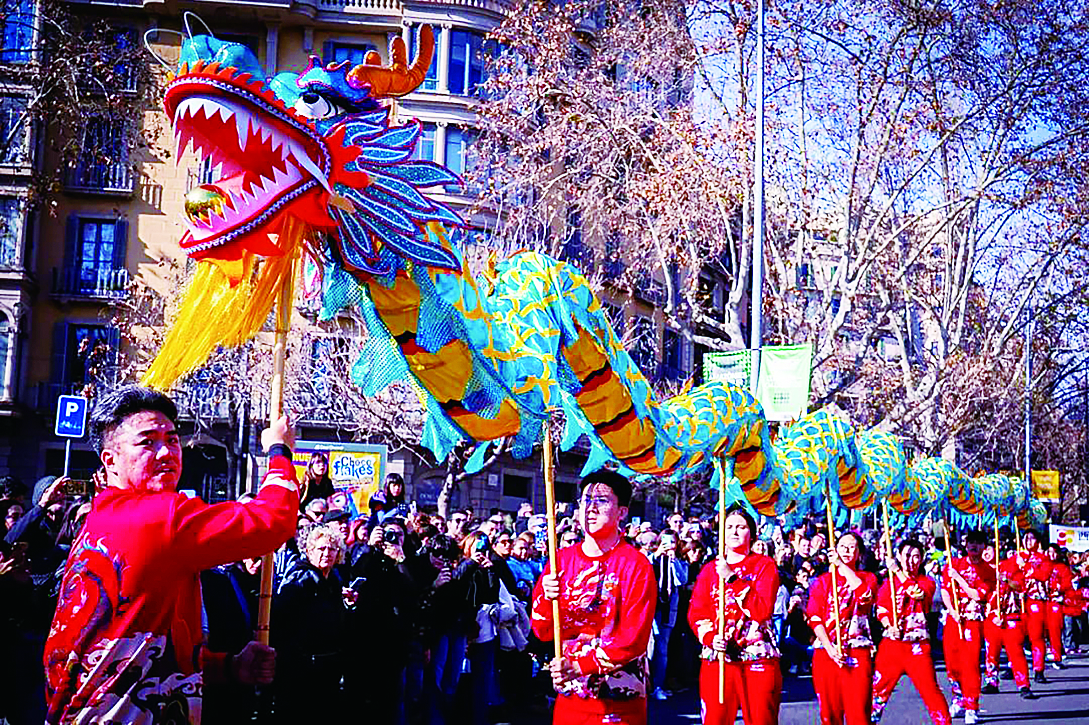 今年农历春节是申遗成功后的首个春节。连日来,海外深圳人积极参与或组织新春活动,传播中华优秀传统文化,共庆中国年,共享欢乐。图为西班牙“与巴塞罗那共庆新春佳节”活动上的舞龙表演。(详见AI13) 深圳侨报通讯员 供图