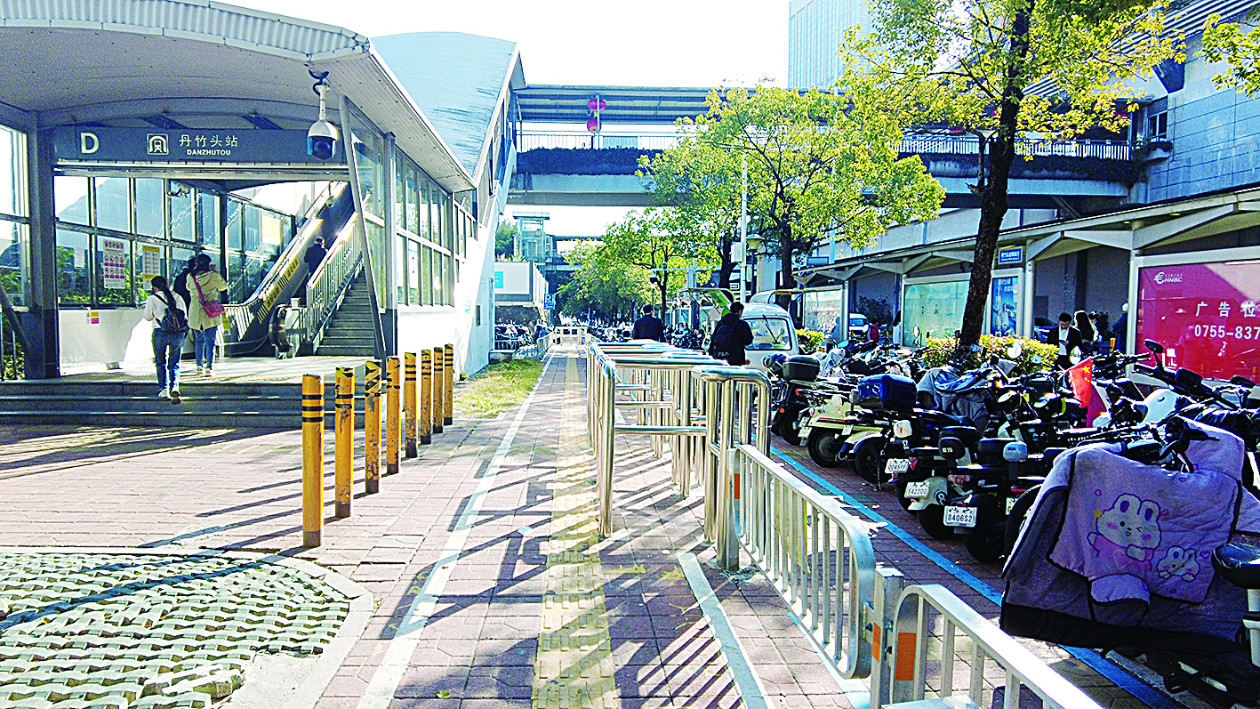 据丹竹头社区相关负责人介绍,该工程施工范围包括龙岗大道南侧千欣街路口至惠沙路路口,以及龙岗大道北侧立信路路口至丹竹头地铁站D出口段的人行道和绿化带部分,施工拆除现状绿化,拆改盲道、人行道,新建非机动车停车位、分隔柱、护栏等。目前,工程已竣工,施工完成加装地铁站A、B出口路中护栏隔离非机动车道,合理规划非机动车道停放区域,并逐步完善相关路权指引、违停警示标志,增设人行道卡口,确保电动自行车有序停放。同时,街道不定期组织交安队员、丹竹头社区工作人员、义工队伍等在地铁站周边开展文明停车劝导行动,坚持电动自行车乱停放“柔性”治理。
