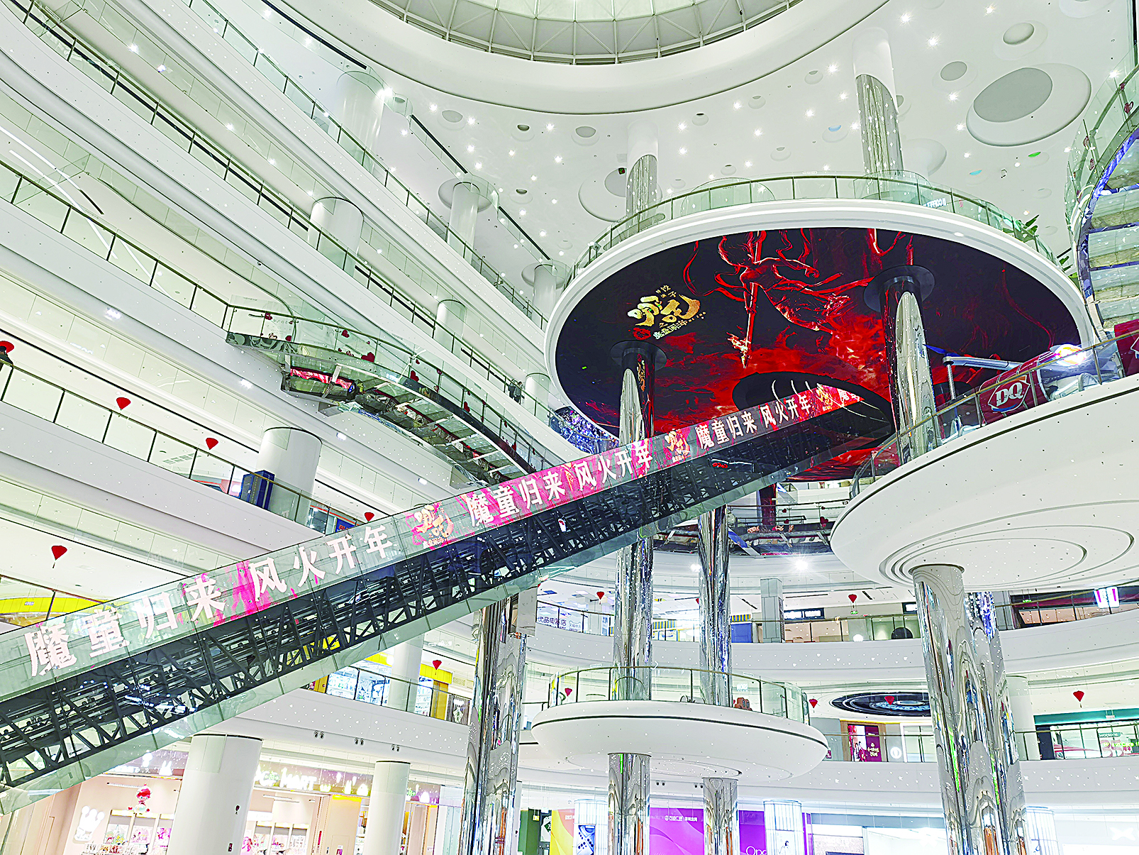 深圳龙岗万达广场的天梯,全长59.7米,高28.5米,是世界上最长的商业室内飞天梯。天梯穿越天眼,直达天穹,不仅是一座1层直飞6层的便捷通道,更是一道独特的风景线,成为深圳一处标志性景点和打卡胜地。连日来,天梯两侧的LED屏幕循环展出“魔童归来 风火开年”的标语,酷似风火轮的“天眼”则不断展出《哪吒之魔童闹海》的精彩海报,仿佛将观众带入了一个奇幻的动画世界。每当夜幕降临,天梯上的灯光与屏幕交相辉映,营造出一种梦幻般的氛围,令人流连忘返。