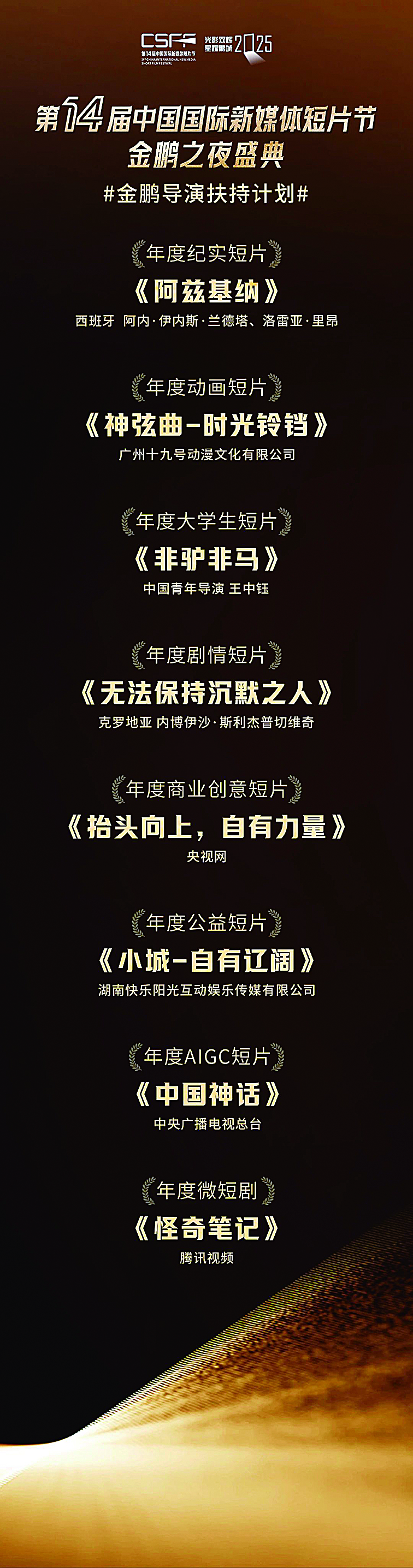 在“金鹏之夜”盛典活动现场,8支入选“金鹏短片导演扶持计划”的短片一一揭晓:克罗地亚导演内博伊沙·斯利杰普切维奇的作品《无法保持沉默之人》入选年度剧情短片;西班牙导演阿内·伊内斯·兰德塔、洛雷亚·里昂的作品《阿兹基纳》入选年度纪实短片;广州十九号动漫文化有限公司推出的《神弦曲-时光铃铛》入选年度动画短片;中国青年导演王中钰的作品《非驴非马》入选年度大学生短片。