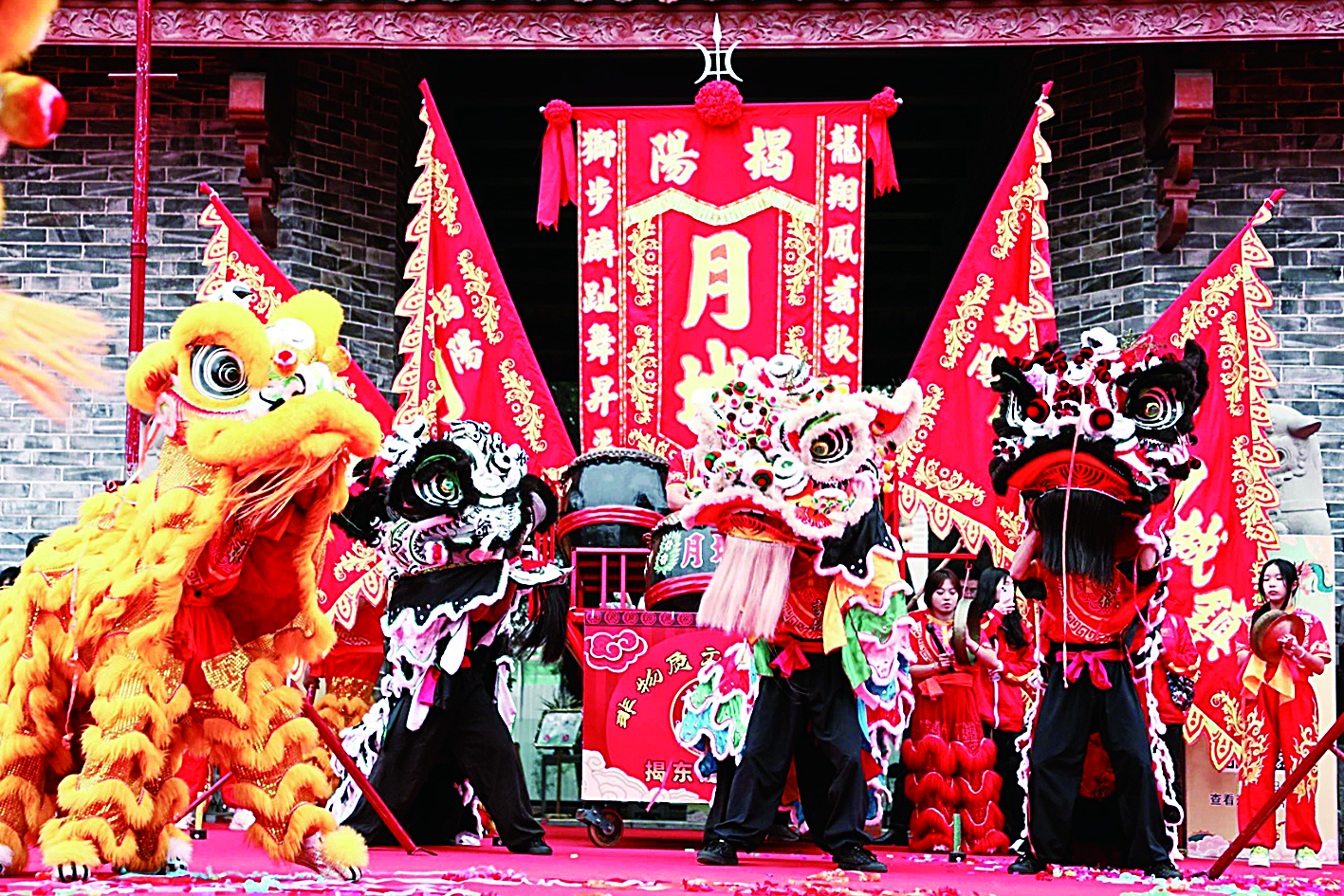 巡游中,龙狮起舞、英歌炸街、布马翩翩、鲤鱼遨游,一个个极具地方特色的非遗项目展演,为海内外观众带来一场潮州“非遗嘉年华”,还有绚丽多彩的标旗和古色古香的花灯点缀其中,阵容庞大,气势恢宏,震撼人心。