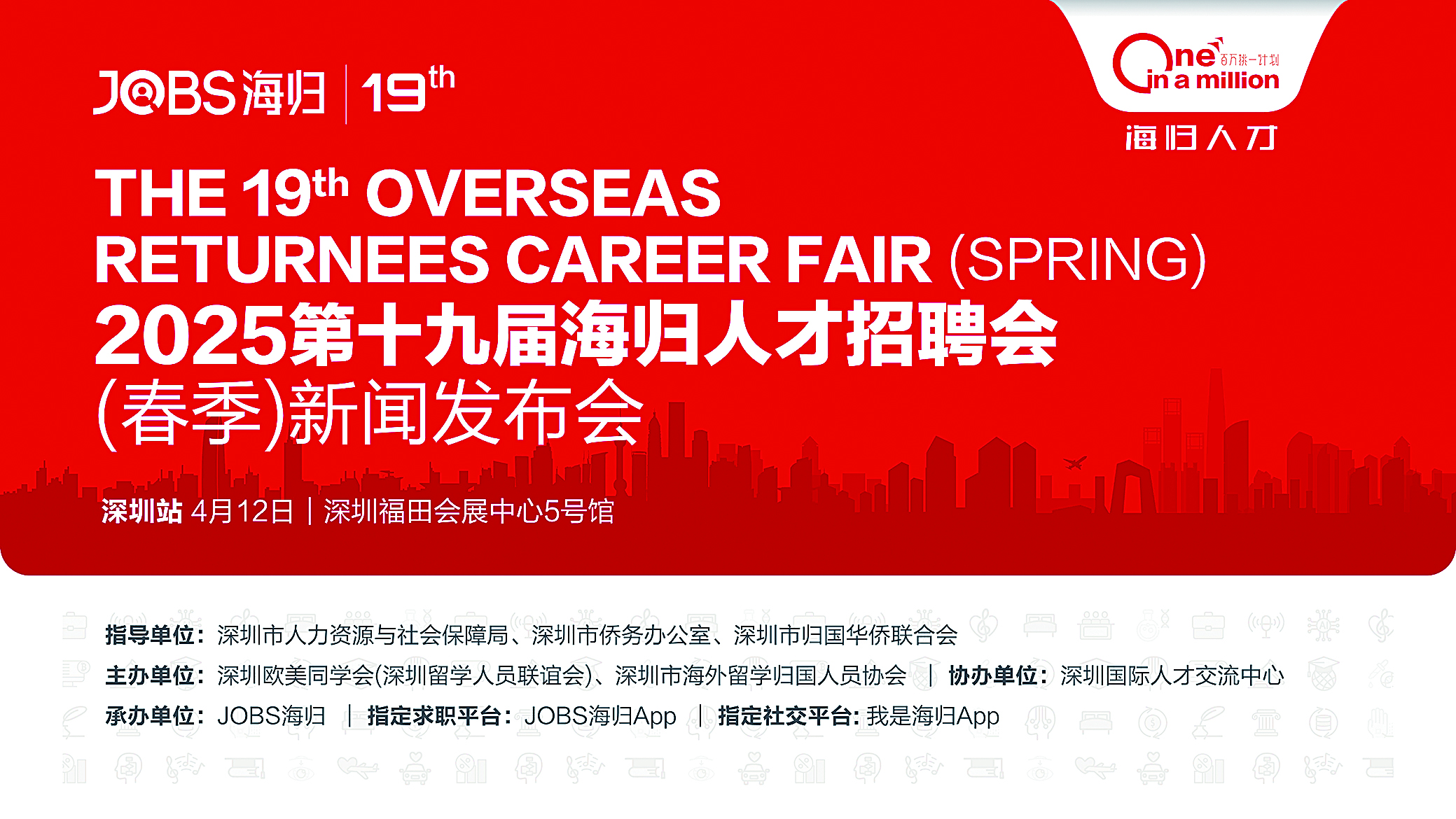 3月13日,2025第十九届海归人才招聘会(春季)新闻发布会在深圳召开。记者从发布会获悉,2025第十九届海归人才招聘会(春季)·深圳站将于4月12日在深圳会展中心5号馆举行,届时近百家知名企业将现场揽才,提供3000+高薪岗位,助力海归人才回国就业创业。