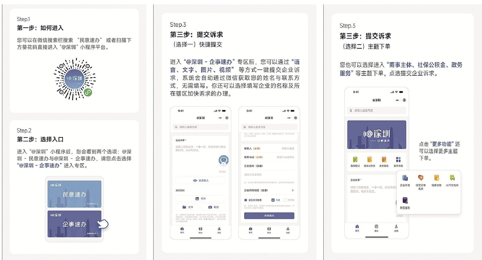 企业反映诉求的操作流程十分简便,通过“i深圳”公众号、“i深圳”APP 或者“@深圳—民意速办”小程序,找到“@深圳—企事速办”入口,选择文字输入或者语音输入,描述诉求内容,根据实际情况填报企业名称、所在辖区、联系人姓名和联系电话,并上传照片、文件、视频作为补充说明,确认无误后提交即可。后台会即刻启动流转程序,将企业诉求精准转至对口职能部门,由专业工作人员跟进办理,力求企业诉求件件有着落、事事有回音,让企业安心放心。