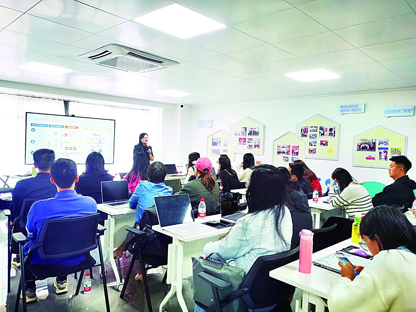 培训邀请麦凯瑞职校资深讲师周桂梅围绕“AI办公实践”授课,讲解如何将AI技术应用于日常办公场景,提升工作效率,并结合“智能写作效能跃升”“PPT自动化设计”等进行案例展示和实操演示,深入浅出地讲解AI技术在日常办公中的应用场景和操作技巧,系统性展示AI技术对传统办公场景的重构路径。同时,通过DeepSeek、豆包等AI平台现场实操演示,指导企业家如何将理论与实践结合起来,运用AI工具高效完成数据分析、PPT制作等办公任务,让繁琐的办公流程化繁为简。