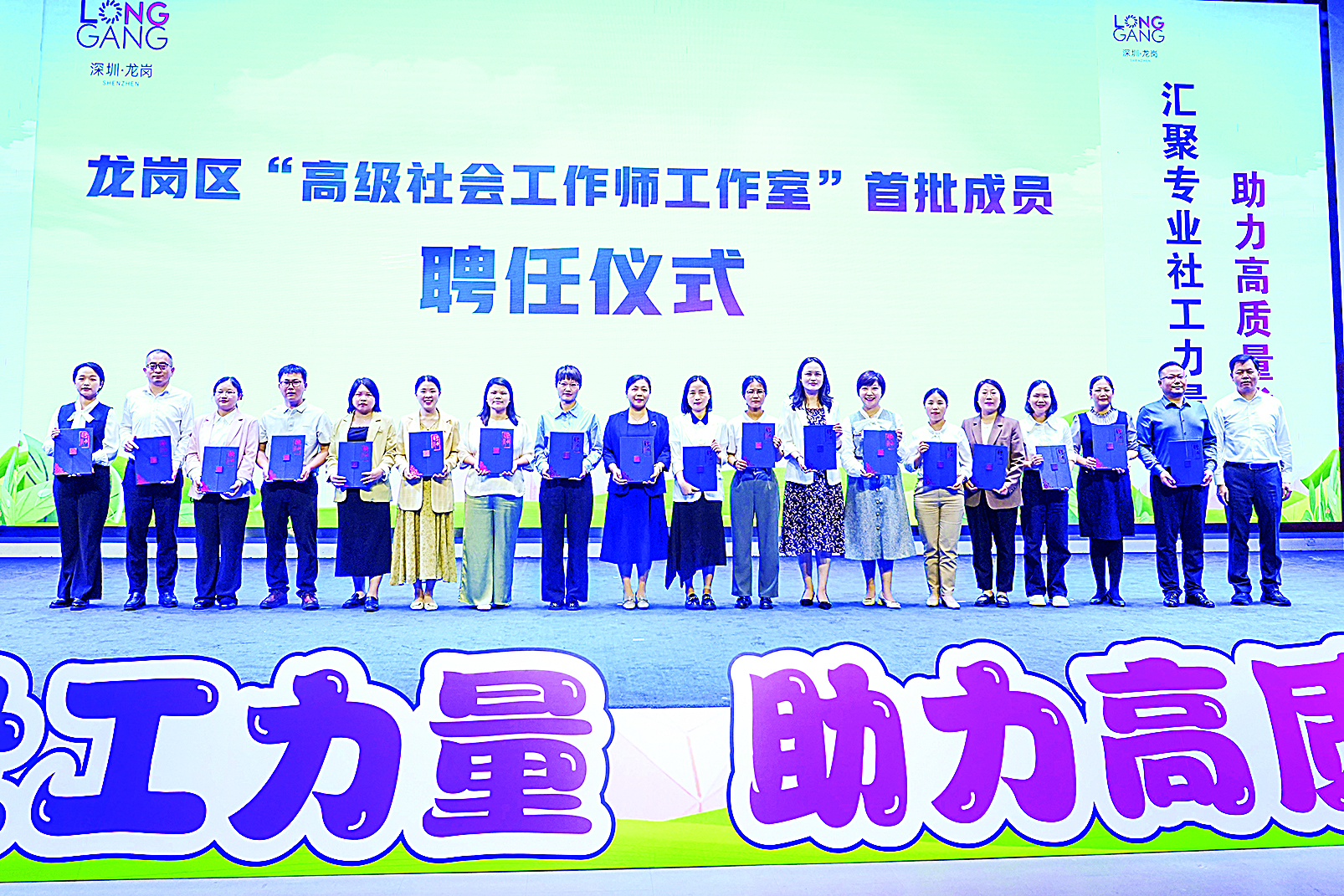 现场为正阳、至诚、彩虹等10家驻区社会组织授予“社会工作实践创新示范基地”牌匾,鼓励各社会服务机构深耕龙岗,汇聚全区社工人才力量,以优质服务为“平安龙岗”筑牢社会治理根基,为“幸福龙岗”注入民生服务温度。